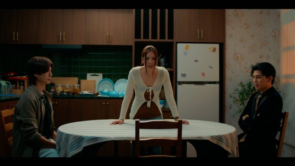 社長室でPeachに薬を塗るKhun Thee。イチャイチャしてると、騒ぎを聞きつけたPeachの妹プラップがMokの制止を無視して突入してきます💦(その前にトイレでイチャついてるのをノートに聞かれていたので付き合ってるのバラされてるけど)手を握っている社長と兄を見て呆然とするプラップ💦
