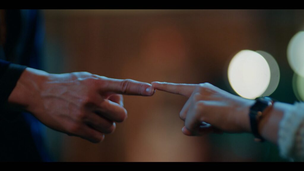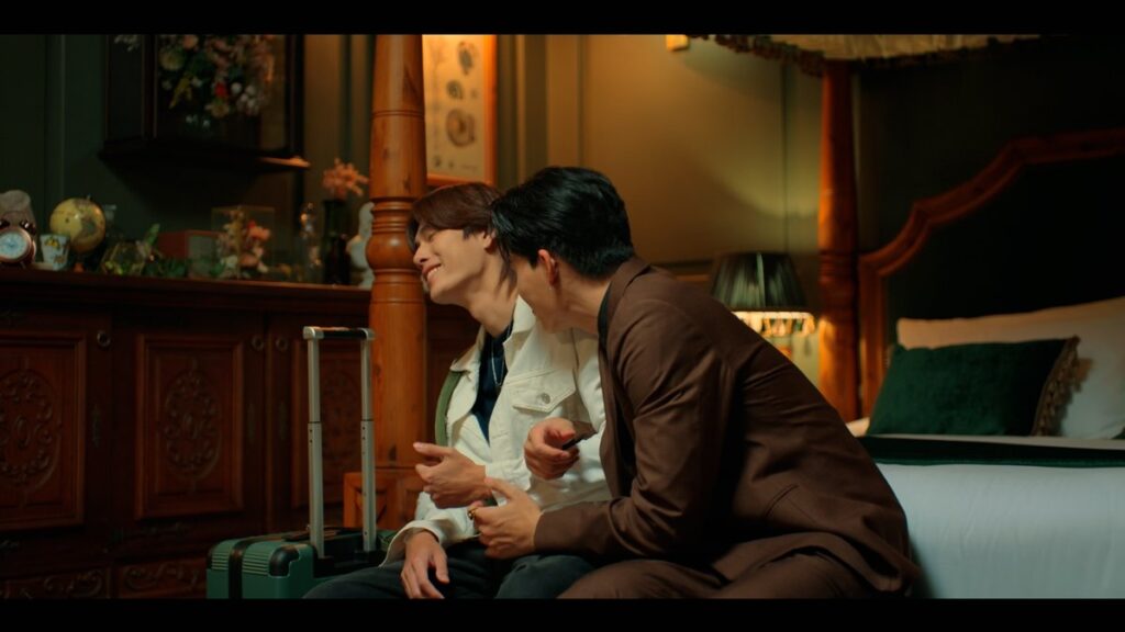 別れ際に「愛してる」とストレートに伝えるKhun Thee。無言で笑顔で去ろうとするPeachの腕を離さないKhun Thee。「君は?」それでも答えずに行こうとするPeachに「私を愛してる?」←言うまで離さない勢い